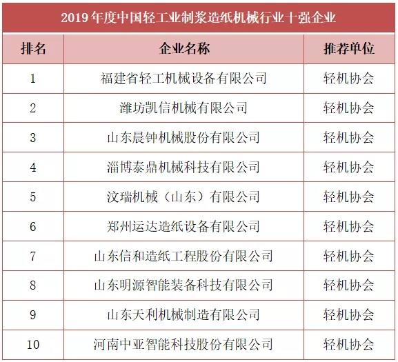 由中國輕工機械協會推薦,與中國輕工業(yè)聯合會共同評選出2019年度中國輕工業(yè)制漿造紙機械行業(yè)十強企業(yè),榜單如下: