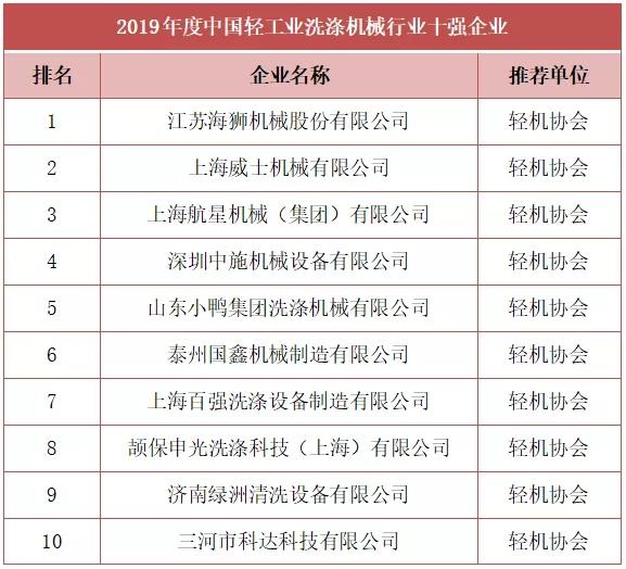 由中國輕工機械協會推薦,與中國輕工業(yè)聯合會共同評選出2019年度中國輕工業(yè)洗滌機械行業(yè)十強企業(yè),榜單如下: