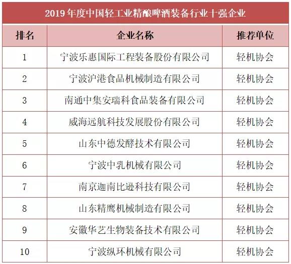 由中國輕工機械協會推薦,與中國輕工業(yè)聯合會共同評選出2019年度中國輕工業(yè)精釀啤酒裝備行業(yè)十強企業(yè),榜單如下: