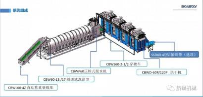航星洗滌龍機(jī)組主要由自動稱重裝載車、隧道式洗滌龍、壓榨式脫水機(jī)、穿梭車、烘干機(jī)和輸送帶組成。如下圖所示: