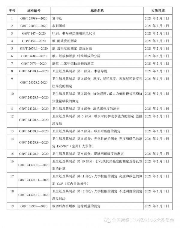 2020年發(fā)布的GB/T 24988—2020《復(fù)印紙》等19項造紙國家標準已于2021年2月1日實施,請各相關(guān)單位積極執(zhí)行新標準。