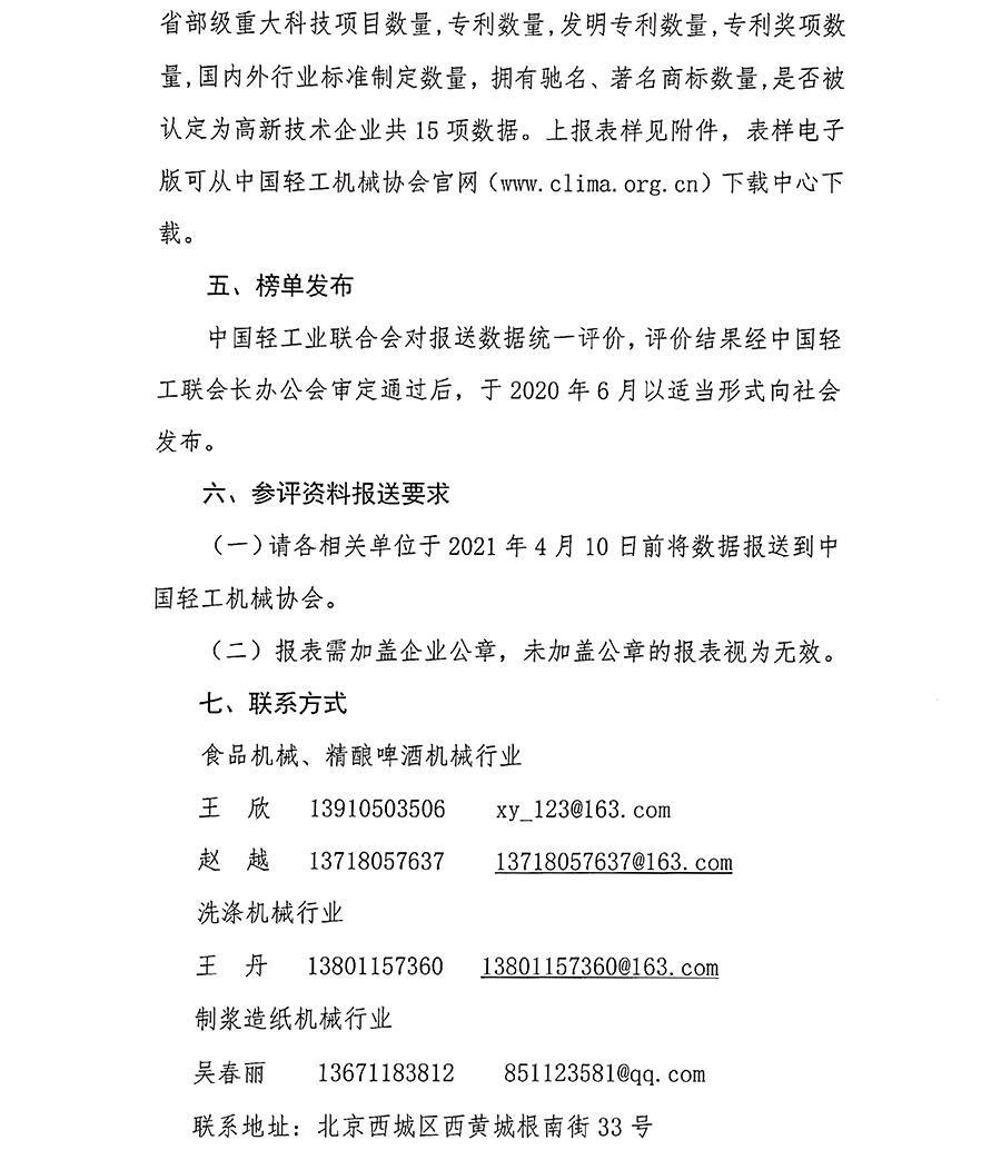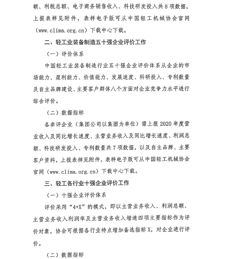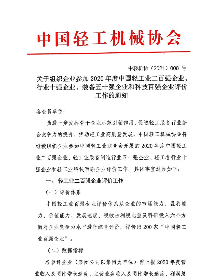 關(guān)于組織企業(yè)參加2020年度中國輕工業(yè)二百強企業(yè)、行業(yè)十強企業(yè)、裝備五十強企業(yè)、科技百強企業(yè)評價工作的通知