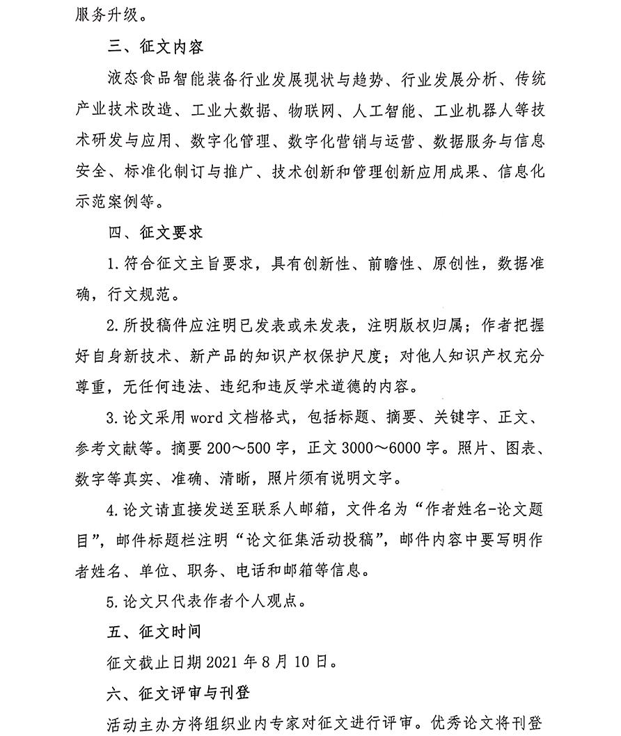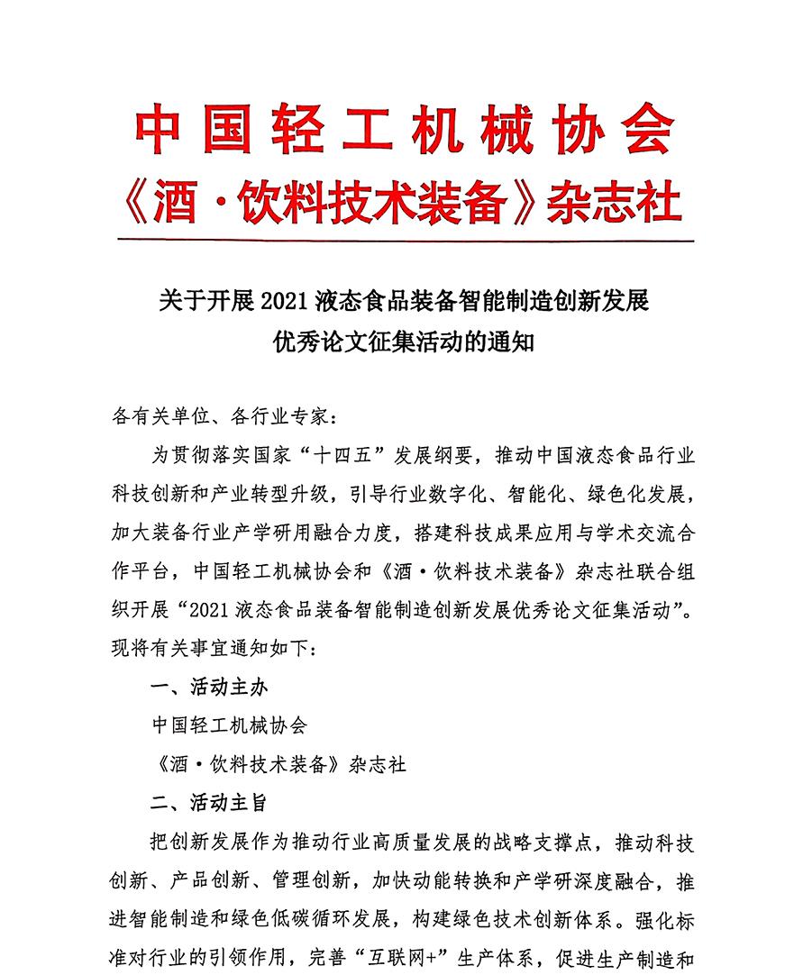 關(guān)于開展2021液態(tài)食品裝備智能制造創(chuàng)新發(fā)展優(yōu)秀論文征集活動(dòng)的通知