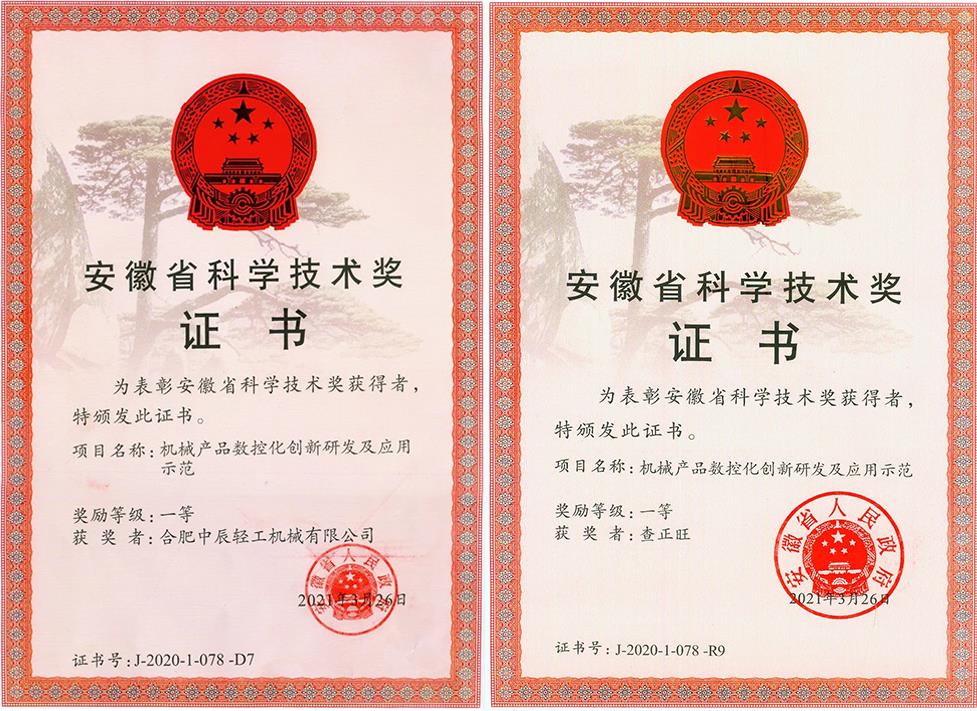 近日,合肥中辰輕工機械有限公司收獲重磅榮譽證書。中辰輕機與合肥工業(yè)大學合作完成的《機械產品數(shù)控化創(chuàng)新研發(fā)及應用示范》項目,被安徽省人民政府授予“安徽省科學技術獎”一等獎。同時,項目負責人之一,中辰輕機董事長查正旺被安徽省人民政府授予“安徽省科學技術獎”一等獎。
