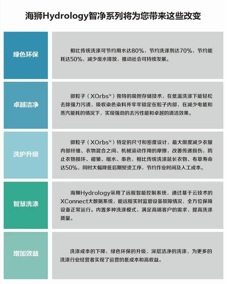 我國東北亞地區(qū)水資源匱乏,生態(tài)環(huán)境較惡劣,這就也一定程度影響到洗染產(chǎn)業(yè)鏈環(huán)境。綠色健康、智慧節(jié)能的洗滌模式也成為此次會議大家共同研究探討的主題,如何創(chuàng)新實現(xiàn)綠色節(jié)能洗滌新環(huán)境,來減少對自然資源的消耗,海獅Hydrology智凈系列產(chǎn)品給出了答案。海獅智凈系列產(chǎn)品引進英國先進的Xorbs微粒子洗滌技術(shù),讓洗滌更潔凈,更節(jié)能,進一步提升了洗滌模式: