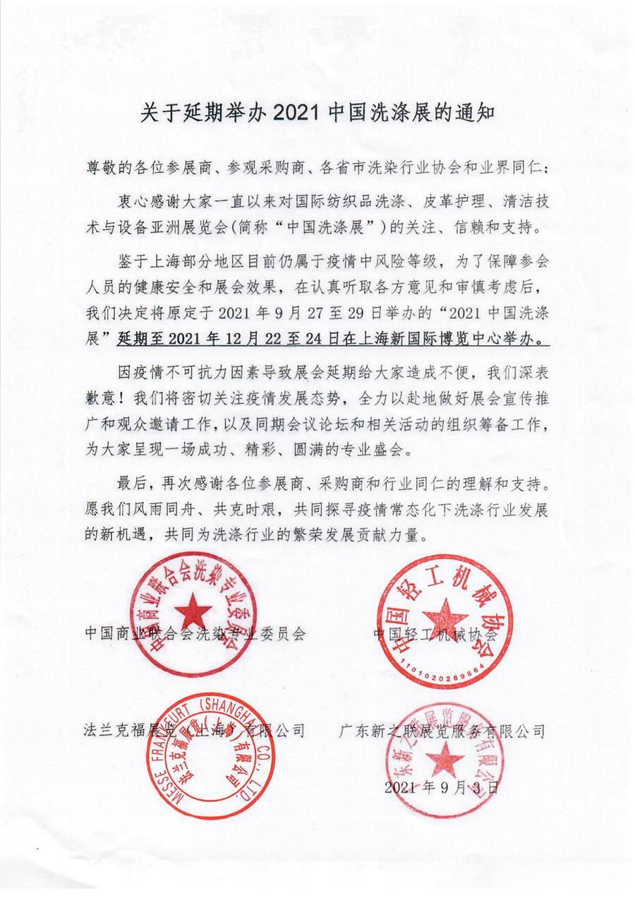 關(guān)于延期舉辦2021中國洗滌展的通知