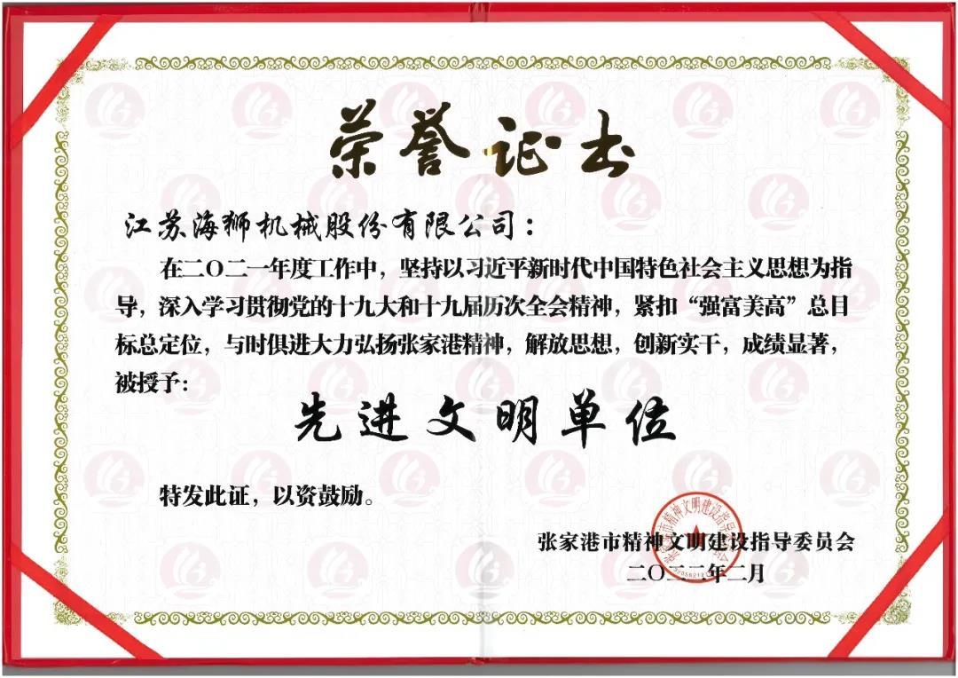 2022虎年張家港第一份文明紅色榜單來了!江蘇海獅機(jī)械股份有限公司榮獲2021年度張家港市先進(jìn)文明單位。